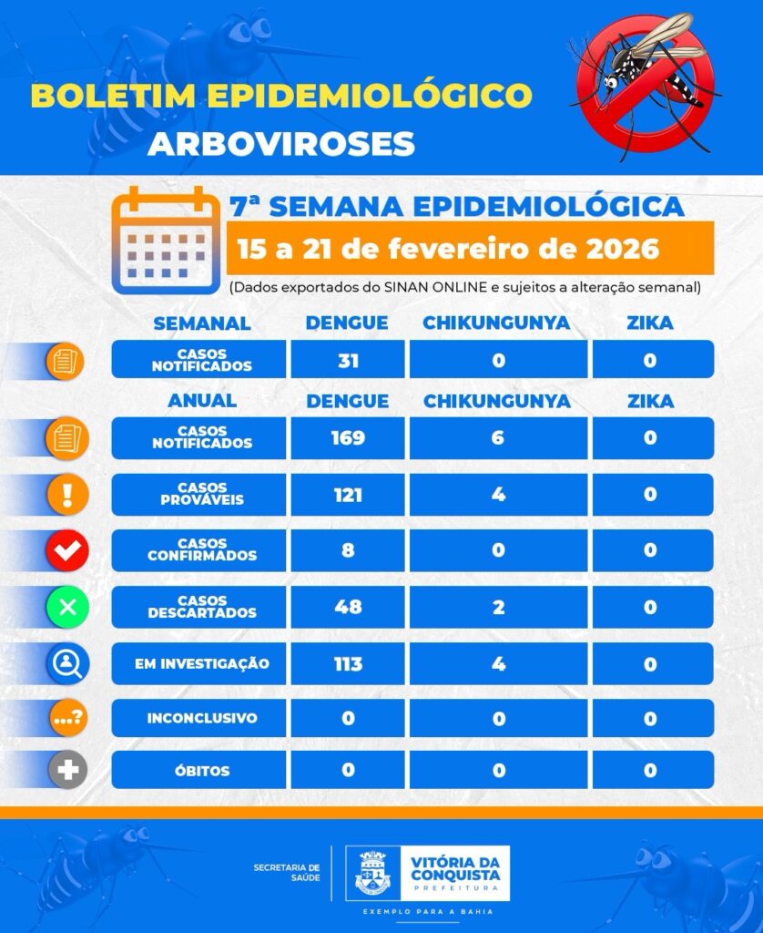 A Secretaria Municipal de Saúde de Vitória da Conquista divulgou o sétimo boletim sobre as arboviroses e acendeu o sinal de alerta em bairros com maior número de notificações.