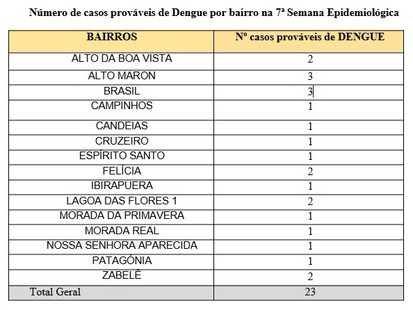 Segundo os dados mais recentes, os bairros Brasil e Alto Maron concentram o maior volume de casos suspeitos de dengue neste início de ano. A Secretaria reforça que essas localidades precisam de atenção redobrada da população no combate ao mosquito.