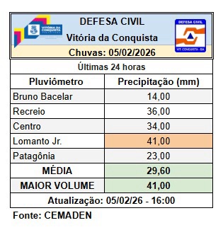 Dados da Defesa Civil apontam que até as 16h o maior volume registrado foi 41 mm no Estádio Lomanto Júnior, com média de 29,60 mm em todo o município.