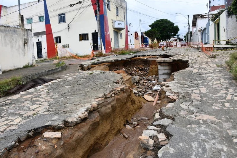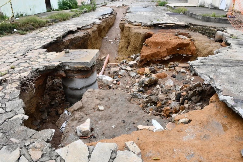 A Rua Lourival Cairo, no bairro Recreio, está totalmente intransitável após os danos causados pelas fortes chuvas registradas em Vitória da Conquista. A força das enxurradas arrancou o calçamento e abriu uma cratera com cerca de dois metros de profundidade.