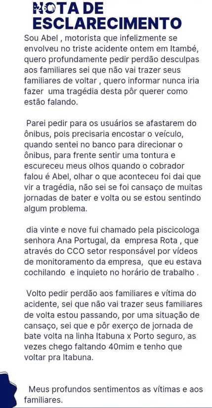 Começou a circular nas redes sociais uma suposta nota de esclarecimento atribuída ao motorista do ônibus, identificado como Abel, envolvido no acidente que invadiu a rodoviária da cidade e deixou duas mulheres mortas e outras pessoas gravemente feridas.