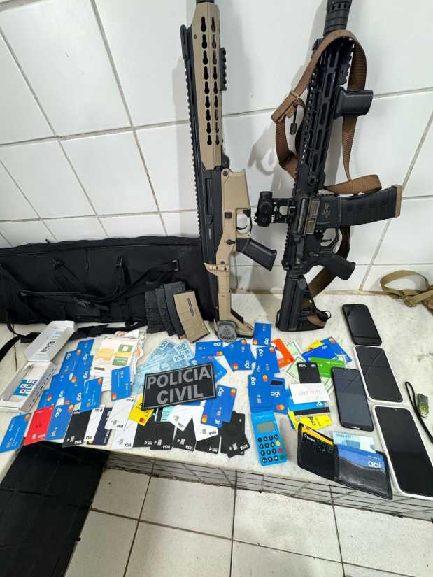 Durante as buscas, foram apreendidos mais de 60 cartões bancários em nomes distintos, além de contratos de empréstimos, documentos diversos, uma máquina de cartão, dois documentos de identidade com o mesmo número e fotos diferentes — o que reforçou a suspeita de falsificação. Também foram recolhidas duas armas de airsoft, um carro da marca Volvo e uma motocicleta Honda Biz.