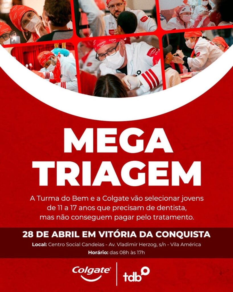 Uma oportunidade importante para crianças e adolescentes de Vitória da Conquista. No dia 28 de abril, a Turma do Bem realiza na cidade a chamada Megatriagem Odontológica 2026, uma mobilização que vai selecionar jovens para receber tratamento dentário gratuito.