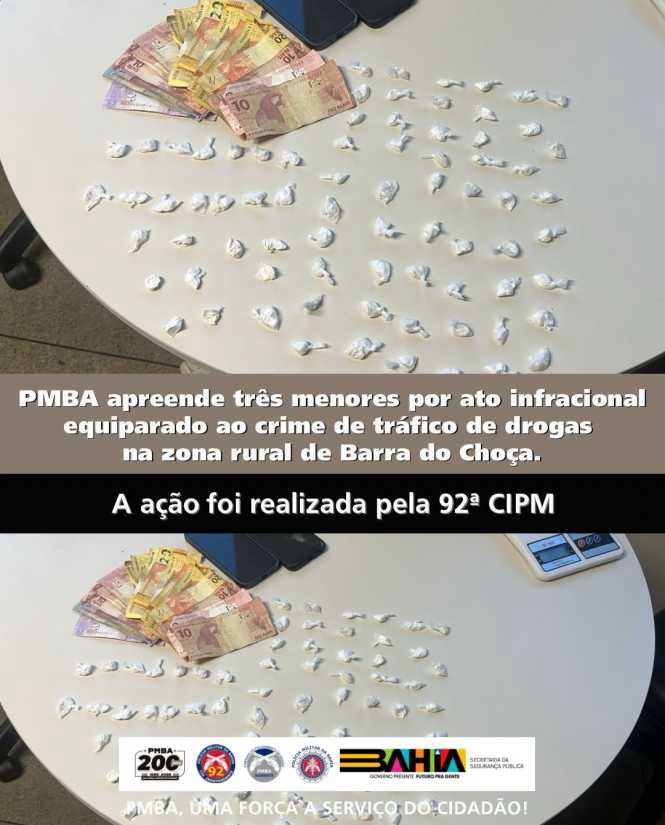 Na tarde desta terça-feira (12), a Polícia Militar, por meio da 92ª CIPM, apreendeu drogas e celulares com menores suspeitos de envolvimento no tráfico no Povoado Cafezal, zona rural de Barra do Choça.