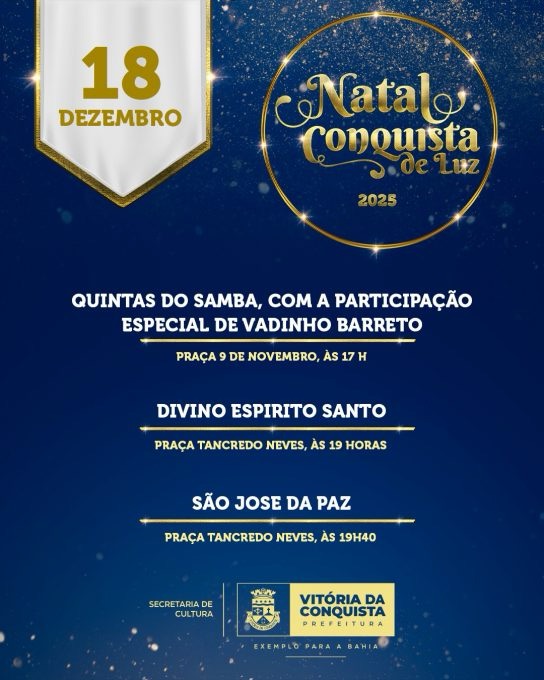 As apresentações culturais do Natal Conquista de Luz começam nesta quinta-feira, dia 18, nas praças Nove de Novembro e Tancredo Neves, no Centro de Vitória da Conquista, e seguem até o dia 6 de janeiro.