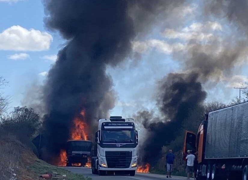 Explosão após colisão entre duas carretas interrompe o trânsito na BR-116, em Poções